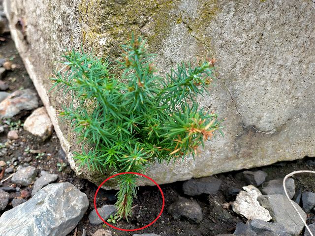 春に、こぼれダネから発芽した株。草丈5cmくらい。